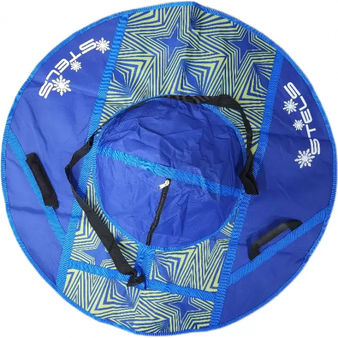 Санки надувные STELS диаметр 110 см. Тент без камеры, верхний слой - ткань с рисунком полотняного переплетения 600D с водонепроницаемой пропиткой на внутренней стороне, нижний слой - гладкая тентовая ткань, наиболее нагруженные швы усилены капроновой лентой, места крепления ручек дополнительно прошиты лавсановой нитью. Надувные санки подарят ребенку незабываемые впечатления и эмоции от катания на снежной и ледяной горке. Благодаря яркой расцветке, неординарному дизайну, такой снегокат - надувное колесо обязательно понравится малышу. Ватрушка обладает особой конструкцией и обеспечивает ребенку максимальную безопасность во время активного отдыха. Волокуши без камеры в сдутом виде занимают минимум места. Поэтому с их хранением не возникнет никаких сложностей. Детские сани имеют удобное сидение и при этом способны выдержать не только ребенка, но взрослого и помогут максимально разнообразить зимние прогулки. Естественно, что такие развлечения обязательно запомнятся детям и вызовут настоящий восторг. Внутренняя камера приобретается дополнительно!