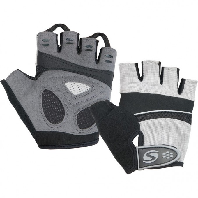 Перчатки CG-1096 защитные летние для велоспорта, обрезанные, из нейлона и замши, перфорированные, c подушками на ладони, c махровой вставкой, с липучкой, с обрезиненным логотипом, чёрно-серые, размер M